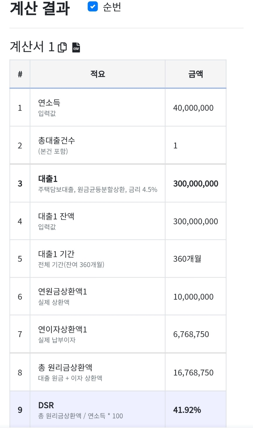 - 주택담보대출 원리금(원금과 이자)의 상환과 신용대출등의 이자를 더한 금액으로 대출금액을 연소득 비율로 제한합니다.